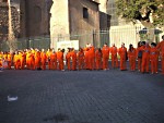 Close Guantanamo Now!The national demonstration, Close Guantanamo Now!, was organized by Amnesty International and held on Saturday, January 17 to mark the seventh anniversary of the arrival the first detainees at the infamous prison and to call for its closure. (See original appeal) Three members of US Citizens for Peace& Justice were among other individuals who volunteered to represent one of the over 250 illegally detained prisoners remaining at Guantanamo. Each volunteer was assigned the name of one of the detainees and participated in the theater-like protest. Dressed in orange jumpsuits with black name stickers on the front, we stood shoulder to shoulder, silently encircling Piazza della Repubblica before beginning our procession to Piazza Barberini. Leaving the piazza, the prisoners walked in single-file, slowly and solemnly down via Barberini while pedestrians silently looked on. Arriving in the piazza, the prisoners sat in semi-circled rows on the ground and listened to an Amnesty International spokesperson reading the grim statistics of international law and human rights violations for which Guantanmo is notorious. He then echoed the sentiments of millions of us around the world when he said that he hoped that Barack Obama would, upon entering office, make good on his promise to close Guantanamo immediately. Before the actor-activist Stefano Lucarelli read selected pieces from a book entitled, "Poesie da Guantanamo" (Poems from Guantanamo), we were reminded that, as in the past, the U. S. government continues to try to silence the voices of the illegal detainees. In the first year of operation when prisoners at Guantanamo were denied pen and paper, many of them used styrofoam cups or napkins on which they wrote poems, using coffee as ink and improvised writing instruments. It was only from 2002 that "some" detainees were given writing materials though since the military refuses to declassify what the prisoners write, claiming that the "content" is a "risk to national security", it cannot be circulated outside the prison. Marc Falkoff, who has represented 17 Guantanamo detainees has complied a number of declassified poems in a book which was released in August 2007. The following is part of one of the poems we heard.