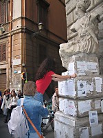 April 15: War Tax DayTax Day in a square in ancient RomeApril 15th is the day Lincoln died, the Titanic sunk and Americans pay their taxes. While the third event may not be as tragic as the first two, the 15th – Tax Payment Day in most of the States of the Union – has begun to make an increasing number of Americans get that sinking feeling. Or even feel shot in the back. At least, when they see where their hard-earned money is going. For under the Bush administration, half (that's right, half) of everything they cough up nowadays goes to the military. For senseless wars of mass destruction. What's left has to cover the expenses of running the entire government -- from foreign affairs to all the domestic agencies -- plus all funding for education, Medicare and other social services as well as for homeland security and public works (just think of all that was NOT spent on hurricane protection in the South). So what better occasion than April 15th to stand in a square in the ancient Trastevere district of Rome handing out leaflets to the visiting American tourists to make sure they realize just what they have financed for another fiscal year? The idea was thrown out on short notice, got only a couple of definite responses, but we decided to make a go at it anyway, and ended up with a dozen of us, between hawkers and standers-by, members of our group and Italian friends, stopping the tourists and explaining why funding war does not increase our security – indeed, it increases our vulnerability since it sparks off retaliation in the peoples we bomb and occupy. Not everyone wanted to listen to this point of view – one person returned our leaflet and presumably it was not to save the paper – but a lot did and a few signed up for our newsletter and the Eyes Wide Open film series. The most successful hawkers of all of us were Chiara and Aidan, the two pre-teen children that an American mother visiting Rome had brought with her to the square. With disarming charm and resoluteness, they managed to stuff leaflets into the hands of the grumpiest looking passers-by. In the end, over 500 flyers in English and Italian were handed out. At times there were more U.S. Citizens for Peace and Justice in the square (right off Piazza Sonnino where via della Lungaretta begins) than there were American tourists. Although Easter has drawn immense crowds – the Italian Tourist Association claims a whopping 20% increase over last year –most were from the large, nearby Catholic countries – Spain, France and Austria – anxious to see the new Pope in his first major liturgical role. Not all spoke English but most took a leaflet anyway and encouraged us to continue. “Our only safety is in peace” they said in Spanish, French and German while waving goodbye – and it didn't take an interpreter to get the message. Patrick Boylan |
